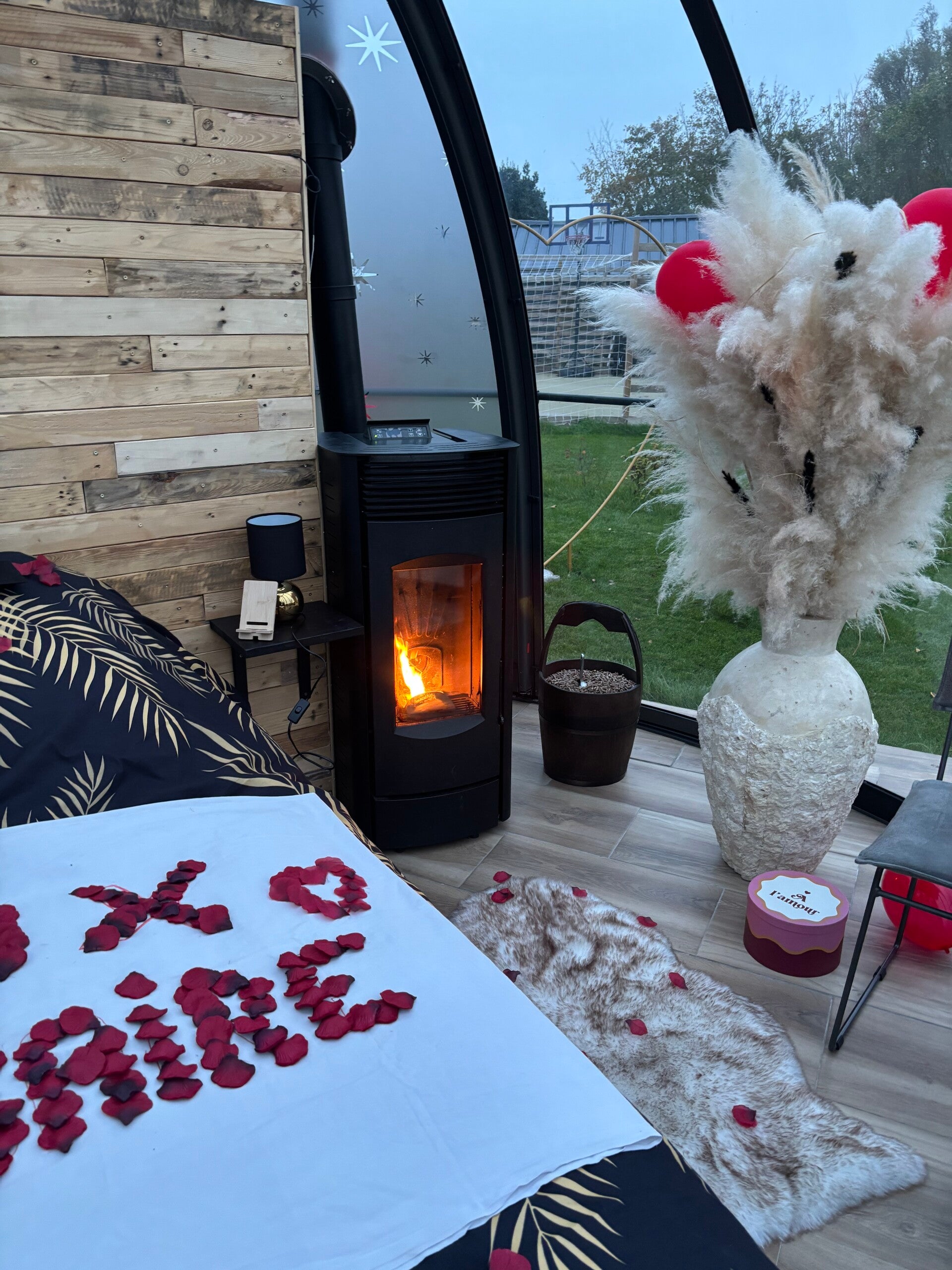 Pensée pour le confort et l’intimité, cette bulle est entièrement équipée, avec ses sanitaires privatifs à l’intérieur (rare !), son poêle à bois pour les nuits fraîches, et une ambiance cocooning idéale pour se reconnecter à l’essentiel.